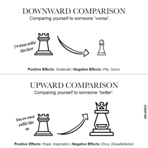 Yukarı Karşılaştırma: Kendinden daha iyi konumdaki birisine bakıp, “Keşke ben de öyle olsaydım” demek. Bu motivasyon verirse iyi; despair yarsa kötü.